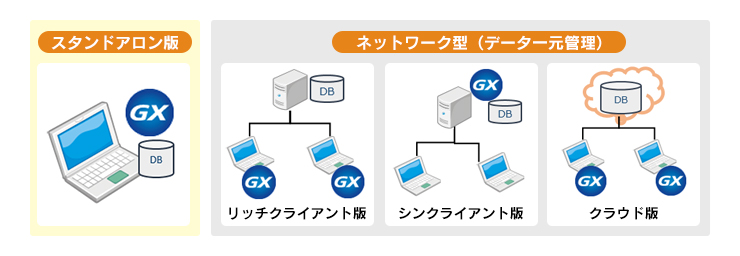 パソコン1台で使用するタイプから、大規模なネットワーク型まで、運用ニーズに合わせてご利用構成を選択できます。また、NSSが管理するクラウド環境で利用することも可能です。