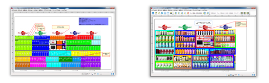 消費者にとって買い易い売場になっているか、色分けしてチェックします。 さらに、棚割上にシェイプを利用して自由にゾーニングを描くことができます。