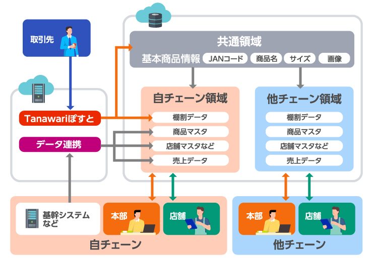 | 商品データ共有 | 共有利用可能 (Tanawariぽすとに投函された 商品情報を他のチェーンと共用) | 共有利用不可 |