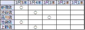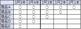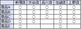 | ③商品と 採用店舗 | 商品と店舗の紐づけを確認する帳票。店舗数が多い場合は一覧性が低いので、上記①と②の組み合わせで見るケースが多い。 | ![]() |