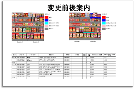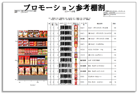 | ②商品と 採用棚割 | 商品と棚割の紐づけを確認する帳票。主に商品の配荷店舗数や、基幹システムの登録状況の確認などに利用される。 | ![]() |