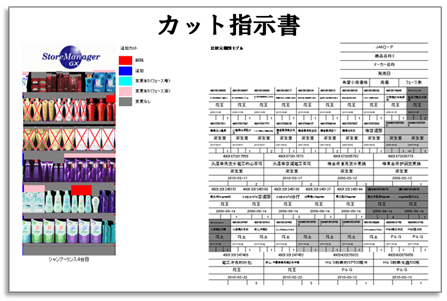 例:カット品にマーカーが付いたカラー陳列図と棚割表など