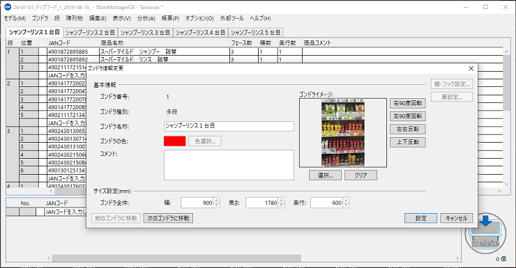 陳列した商品には、フェース数、積数、奥行数、商品コメントなどを設定することができます。 売場イメージが必要な場合は売場写真を保存することができます。