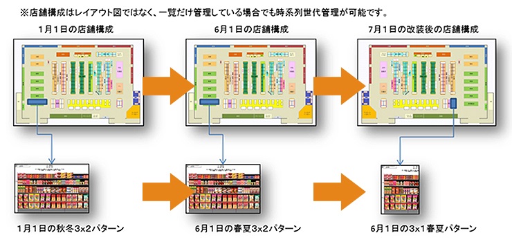 店舗構成は、時系列に世代管理ができます。店舗構成と棚割の時間軸を合わせた紐づけが可能です。