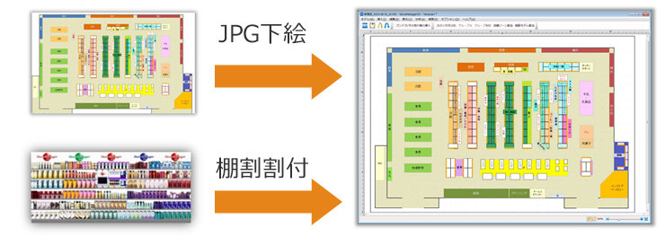 JPGもしくはBMPなどのイメージデータを下絵にして、Officeライクに店内領域、ゴンドラ、レジなどのオブジェクトを配置します。