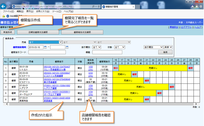 棚替予定日、本部棚替指示日、店舗適用開始日などを自動発注システム等に連携することができます。